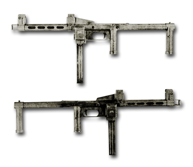 - -A crude last-ditch submachine gun made from stamped steel tubes